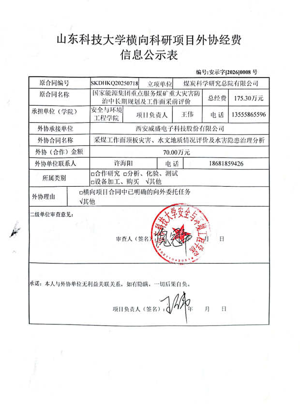 根据《山东省人民政府办公厅印发关于进一步完善财政科研项目资金管理的若干措施的通知》(鲁政办字〔2019〕120号)以及《中文无码 横向科研项目与经费管理办法(试行)》(山科大发〔2020〕64号)相关规定,现对 王伟 为项目负责人的 国家能源集团重点服务煤矿重大灾害防治中长期规划及工作面采前评价 项目的外协经费情况进行公示,公示时间为 2026年4月14日-2025年4月21日 。若对本项外协经费有异议,请于公示期内向中文无码 反映并提交书面材料。