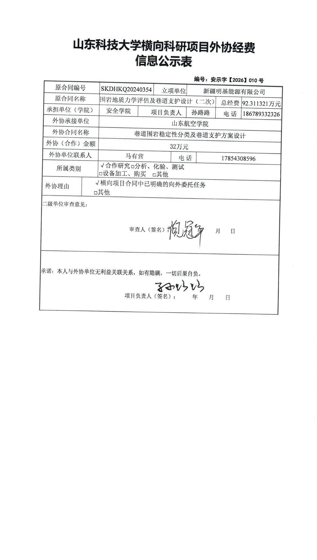 根据《山东省人民政府办公厅印发关于进一步完善财政科研项目资金管理的若干措施的通知》(鲁政办字〔2019〕120号)以及《中文无码 横向科研项目与经费管理办法(试行)》(山科大发〔2020〕64号)相关规定,现对孙路路为项目负责人的 围岩地质力学评估及巷道支护设计(二次) 项目的外协经费情况进行公示,公示时间为 2026年04月20日至2026年04月24号(五个工作日) 。若对本项外协经费有异议,请于公示期内向中文无码 反映并提交书面材料。