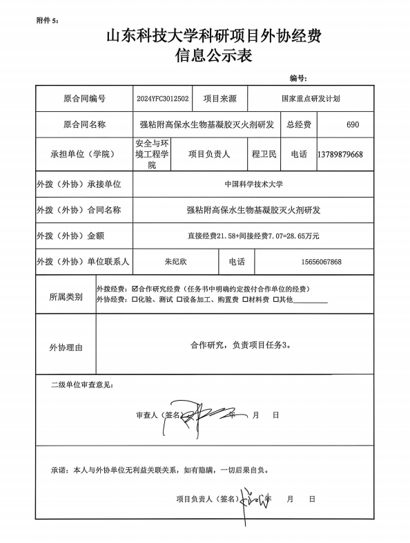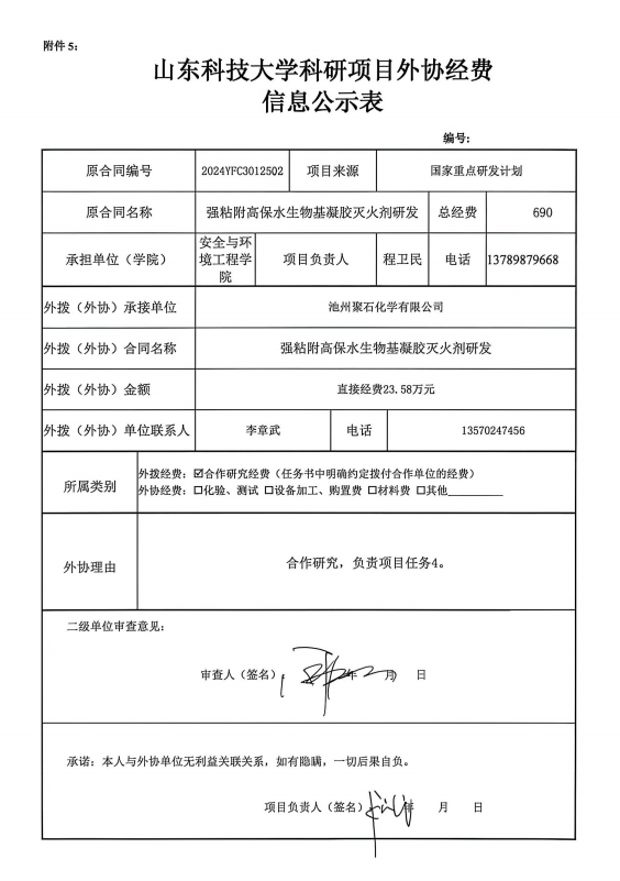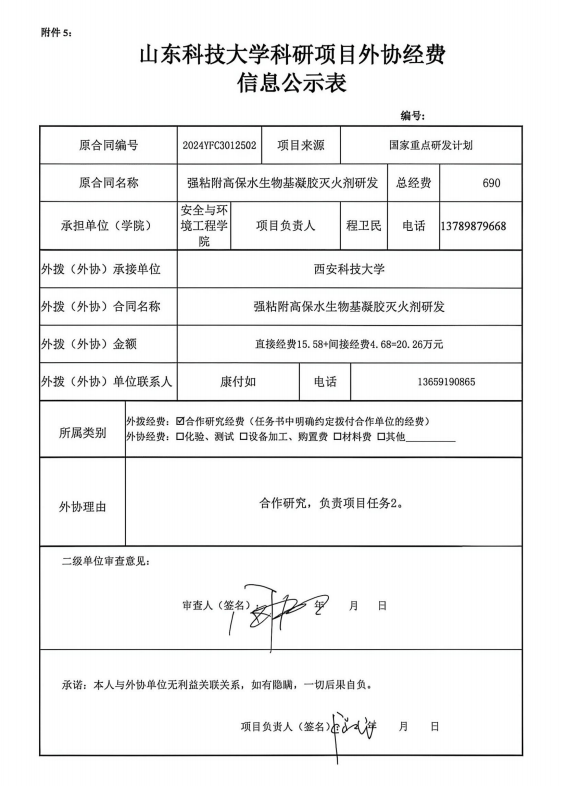 根据《山东省人民政府办公厅印发关于进一步完善财政科研项目资金管理的若干措施的通知》(鲁政办字〔2019〕120号)以及《中文无码 科研项目与经费管理办法(试行)》(山科大发〔2020〕64号)相关规定,现对程卫民为项目负责人的强粘附高保水生物基凝胶灭火剂研发项目的外协经费情况进行公示,公示时间为 2026年4月20日~2026年4月24日(公示时间不少于5个工作日)。若对本项外协经费有异议,请于公示期内向中文无码 或科技处反映并提交书面材料。